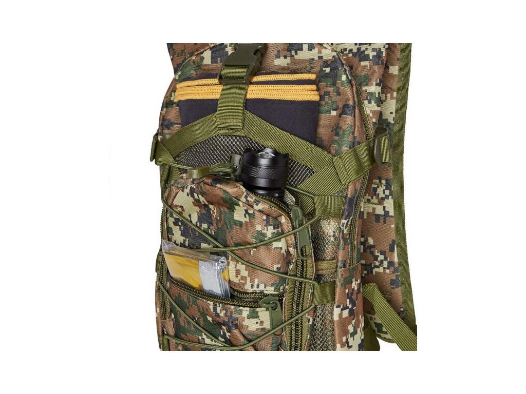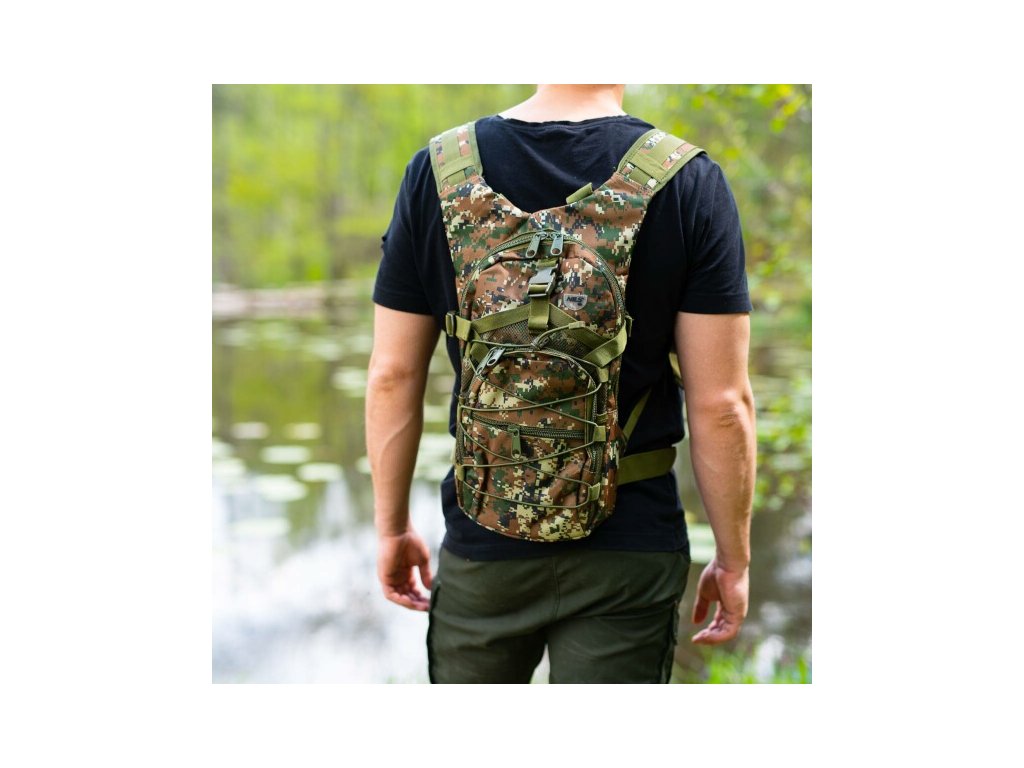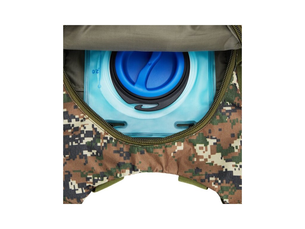 Hlavní komora batohu je opatřena přepážkou, v horní části se nachází 2 karabiny pro zavěšení hydrovaku (není součástí dodávky). Hadičku hydrovaku lze vyvést průvlaky na pravé i na levé straně pod ramenními panely. Na hlavní komoře se nacházejí další úložné prostory a to velká síťovaná kapsa s popruhem a přezkou - menší otevřená, síťovaná kapsa - 2. komora na zip - kapsa na zip (například pro mobilní telefon a peněženku) a gumová šňůra s brzdičkou, pod kterou lze přenášet například cyklistickou helmu, nebo karimatku. Po stranách batohu se nachází kompresní popruhy, které stahují hlavní komoru a obě síťované kapsy. Na horní straně je robustní ucho pro pohodlné přenášení batohu v ruce. Zadní strana a ramenní popruhy jsou polyesterové bez polstrování. Na popruzích je gumové poutko k provlečení hadičky hydrovaku a hrudní popruh, ten je výškově a délkově nastavitelný. Bederní popruh s robustní přezkou má šířku 3,5 centimetru.