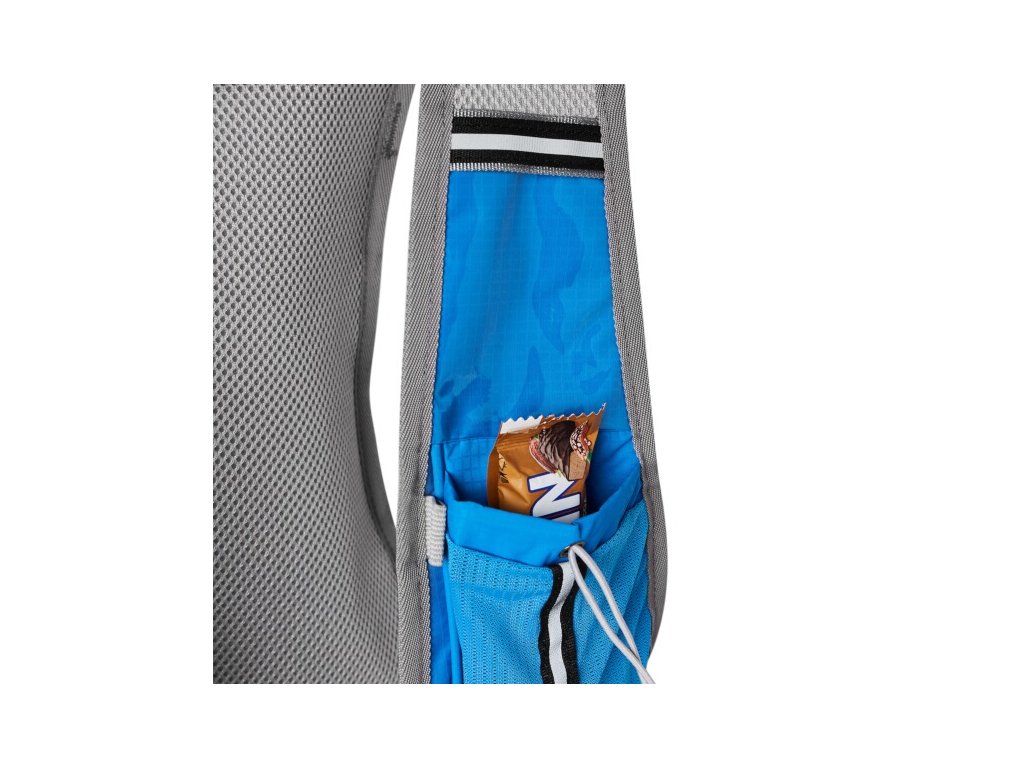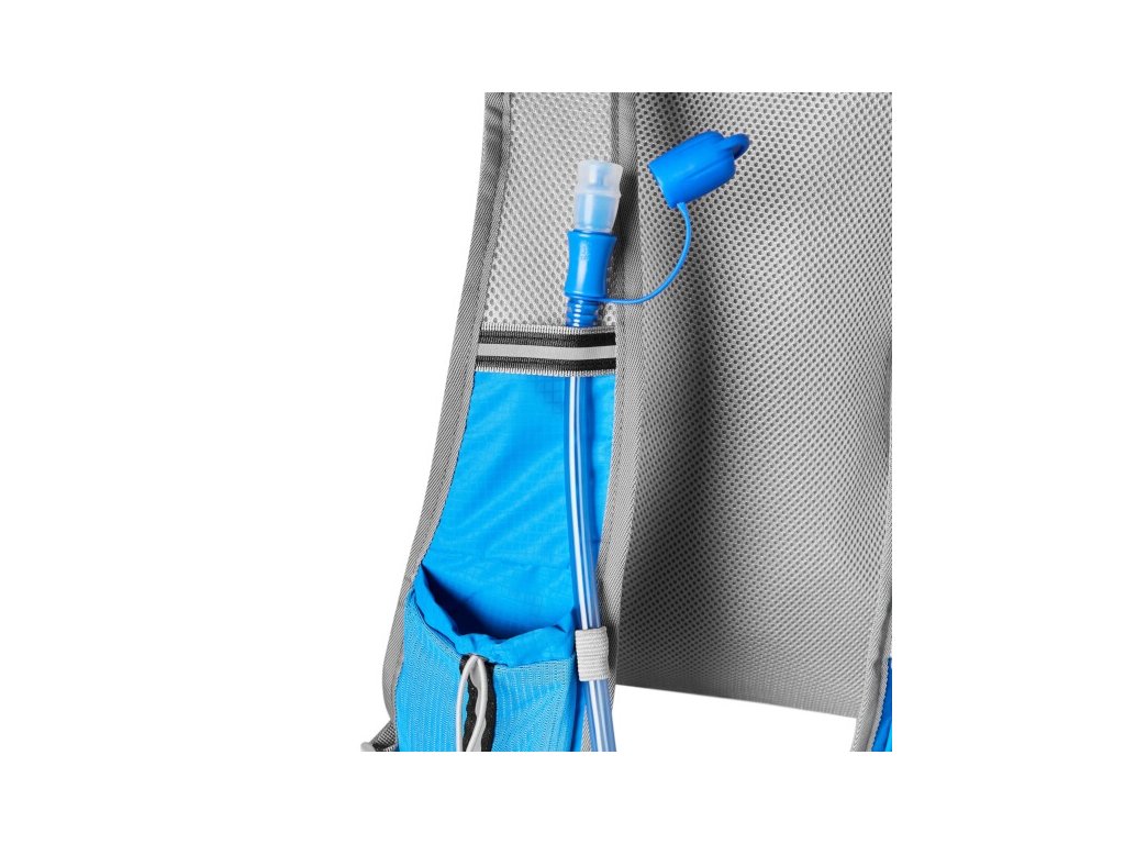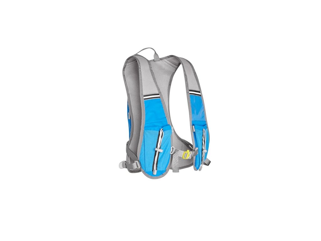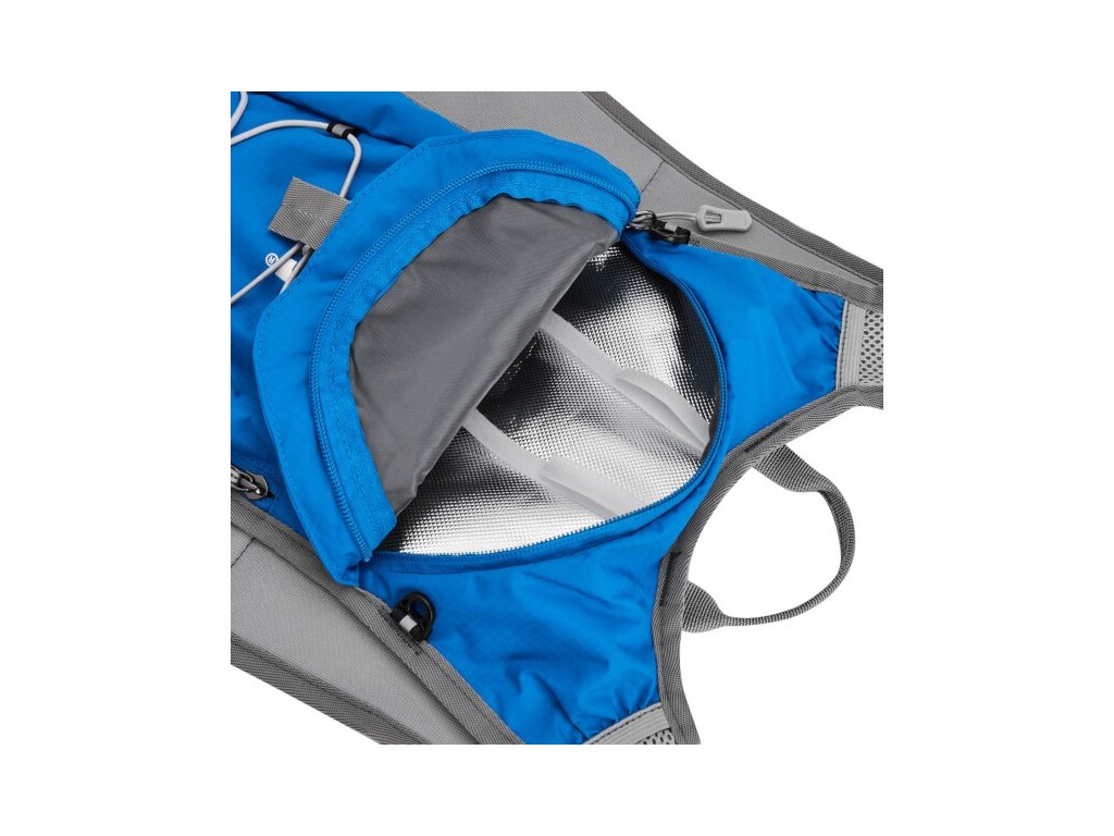 Hlavní komora batohu je opatřena přepážkou, v horní části se nachází 2 suché zipy pro zavěšení hydrovaku (není součástí dodávky). Zadní strana hlavní komory je opatřena hliníkovou fólií, která slouží jako izolace mezi hydrovakem a zády, takže nápoj se nebude ohřívat teplem od zad. Hadičku hydrovaku lze vyvést průvlaky na pravé i na levé straně pod ramenními panely. Přední strana batohu je opatřena gumovým lankem s brzdičkou, pod které lze uložit například karimatku. Níže nalezneme kapsu, ve které se skrývá síťka, kterou lze vytáhnout a pomocí karabinek připnout ke stranám batohu, síťka následně vytvoří kapsu, co které můžeme uložit například cyklistickou helmu, ešus apod.. Pod kapsou je reflexní panel, ke kterému si můžeme připnout další vybavení. Na pravé straně se skrývá další kapsa na zip, která je ideální pro telefon, peněženku, nebo například klíče. Na horní straně batohu je poutko pro snadné přenášení batohu v ruce. Záda a ramenní popruhy jsou vyrobeny ze síťoviny doplněné o prodyšnou pěnu, která zvyšuje prodyšnost panelu a záda se budou méně potit. Ramenní popruhy jsou opatřeny reflexními řemínky pro protažení hadičky od hydrovaku a kapsami ze síťoviny. Na levém popruhu se navíc nachází kapsička s průhlednou čelní stranou, do které lze uložit například kartičku pro případ ztráty, startovní číslo a podobně. Ramenní popruhy jsou spojeny hrudním pásem, který lze výškově nastavit. Popruh je spojen plastovou přezkou s píšťalkou.