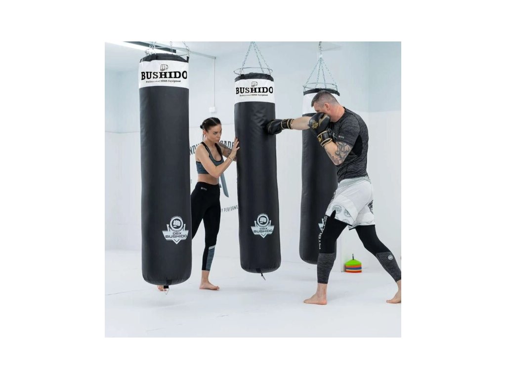 Profesionální boxovací pytel DBX BUSHIDO 160 x 40 cm. Délka řetězů při zavěšení 45 cm (díky karabině lze nastavit i kratší délku).