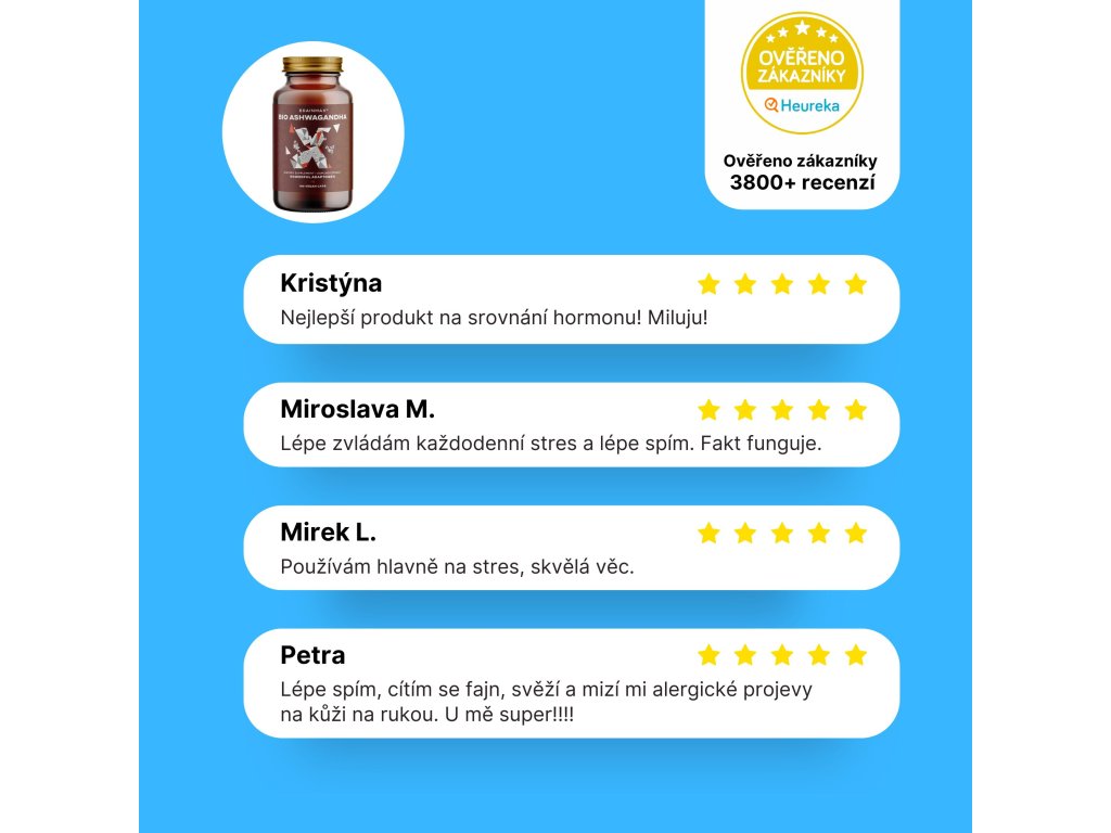 Snižuje stresový hormon kortizol3,4 a podporuje kvalitní spánek8 Léčivo v ajurvédě již před více než 3000 lety 100% čistá a nezpracovaná BIO Ashwagandha Snižuje stres, zlepšuje spánek, omlazuje a podpoří relaxaci Ashwagandha je jedním z nejvýznamnějších adaptogenů na světě, tradičně používána v ajurvédě, byla předmětem více než 300 klinických studií a její užívání doporučuje např. neurovědec Andrew Huberman. Její široké spektrum účinků na duševní i fyzickou pohodu z ní činí komplexní přírodní doplněk, který pomáhá harmonizovat hektický životní styl, zvyšuje odolnost organismu vůči stresu a přispívá k dlouhodobé optimalizaci. Jak fungují adaptogeny? Ashwagandha jako adaptogen, je známá svou schopností pomáhat zvyšovat sílu, vytrvalost a optimalizovat hormony. Adaptogeny pomáhají zvyšovat odolnost na stres a snižovat úzkost tím, že zabraňují uvolňování stresových hormonů (CRH -> kortizol). Jinými slovy, pomáhají snižovat potřebu vašeho těla produkovat stresové hormony v reakci na stres. Nedochází tak k adrenálnímu vyčerpání a dalším negativním efektům spojeným s dopady stresu, jako jsou: úzkost, hormonální nerovnováha, ztráta libida nebo problémy se štítnou žlázou. Ověřeno studiemi! WANKHEDE, Sachin, Deepak LANGADE, Kedar JOSHI, Shymal R SINHA a Sauvik BHATTACHARYYA. Examining the effect of Withania somnifera supplementation on muscle strength and recovery: a randomized controlled trial. 2015. AMBIYE, Vijay R, Deepak LANGADE, Swati DONGRE, Pradnya APTIKAR, Madhura KULKARNI a Atul DONGRE. Clinical Evaluation of the Spermatogenic Activity of the Root Extract of Ashwagandha (Withania somnifera) in Oligospermic Males: A Pilot Study. 2013. DONGRE, Atul, Shreya CHAKRABORTY, Uttpal ANAND, et al. Withania somnifera (L.) Dunal (Ashwagandha): A comprehensive review on ethnopharmacology, pharmacotherapeutics, biomedicinal and toxicological aspects. 2021. CHANDRASEKHAR, K, Jyoti KAPOOR a Sridhar ANISHETTY. A prospective, randomized double-blind, placebo-controlled study of safety and efficacy of a high-concentration full-spectrum extract of ashwagandha root in reducing stress and anxiety in adults. 2012. RAUT, Ashwinikumar A, Nirmala N REGE, Firoz M TADVI, Punita V SOLANKI, Kirti R KENE, Sudatta G SHIROLKAR, Rama A VYIDYA a Ashok B VAIDYA. Exploratory study to evaluate tolerability, safety, and activity of Ashwagandha (Withania somnifera) in healthy volunteers. 2012. Ověřeno studiemi! CHOUDHARY, Dnyanraj, Sauvik BHATTACHARYYA a Sekhar BOSE. Efficacy and Safety of Ashwagandha (Withania somnifera (L.) Dunal) Root Extract in Improving Memory and Cognitive Functions. 2017. GOPUKUMAR, Kumarpillai, Shefali THANAWALA, Venkateswarlu SOMEPALLI, T S Sathyanaryana RAO, Vijaya Bhaskar THAMATAM a Sanjaya CHAUHAN. Efficacy and Safety of Ashwagandha Root Extract on Cognitive Functions in Healthy, Stressed Adults: A Randomized, Double-Blind, Placebo-Controlled Study. 2021. MIKULSKA, Paulina, Marta MALINOWSKA, Milosz IGNACYK, et al. Ashwagandha (Withania somnifera)—Current Research on the Health-Promoting Activities: A Narrative Review. 2023. AJGAONKAR, Ashutosh, Mukta JAIN a Khokan DEBNATH. Efficacy and Safety of Ashwagandha (Withania somnifera) Root Extract for Improvement of Sexual Health in Healthy Women: A Prospective, Randomized, Placebo-Controlled Study. 2022. AMBIYE, Vijay R, Deepak LANGADE, Swati DONGRE, Pradnya APTIKAR, Madhura KULKARNI a Atul DONGRE. Clinical Evaluation of the Spermatogenic Activity of the Root Extract of Ashwagandha (Withania somnifera) in Oligospermic Males: A Pilot Study. 2013. Dávkování 1 kapsle 1-3 krát po jídle. Doporučujeme užívat 6 týdnů a poté udělat 10 denní pauzu. Následně můžete opět pokračovat v užívání. Nedoporučujeme užívat při onemocnění štítné žlázy bez porady s lékařem. 1 rostlinná kapsle Množství v 1 kapsli %RHP* BIO Ashwagandha 560 mg *** * % denní referenční hodnoty příjmu*** denní referenční hodnota příjmu není stanovena BIO certifikace CZ-BIO-001 Naše Ashwagandha má BIO certifikát - Produkce ekologického zemědělství mimo EU. Nákupem podpoříte i české lesy #stromzaobjednavku! Složení: 100% BIO kořen Ashwagandhy (Withania somnifera) Distributor: BRAINMARKET s.r.o., Hladnovská 83/93, Ostrava Upozornění: Ukládat mimo dosah dětí. Výrobek není určen pro těhotné a kojící ženy. Neslouží jako náhrada pestré stravy. Dodržujte zdravý životní styl. U citlivých jedinců může ashwagandha vyvolat žaludeční nevolnost nebo alergickou reakci. Hmotnost: 100 rostlinných kapslí.
