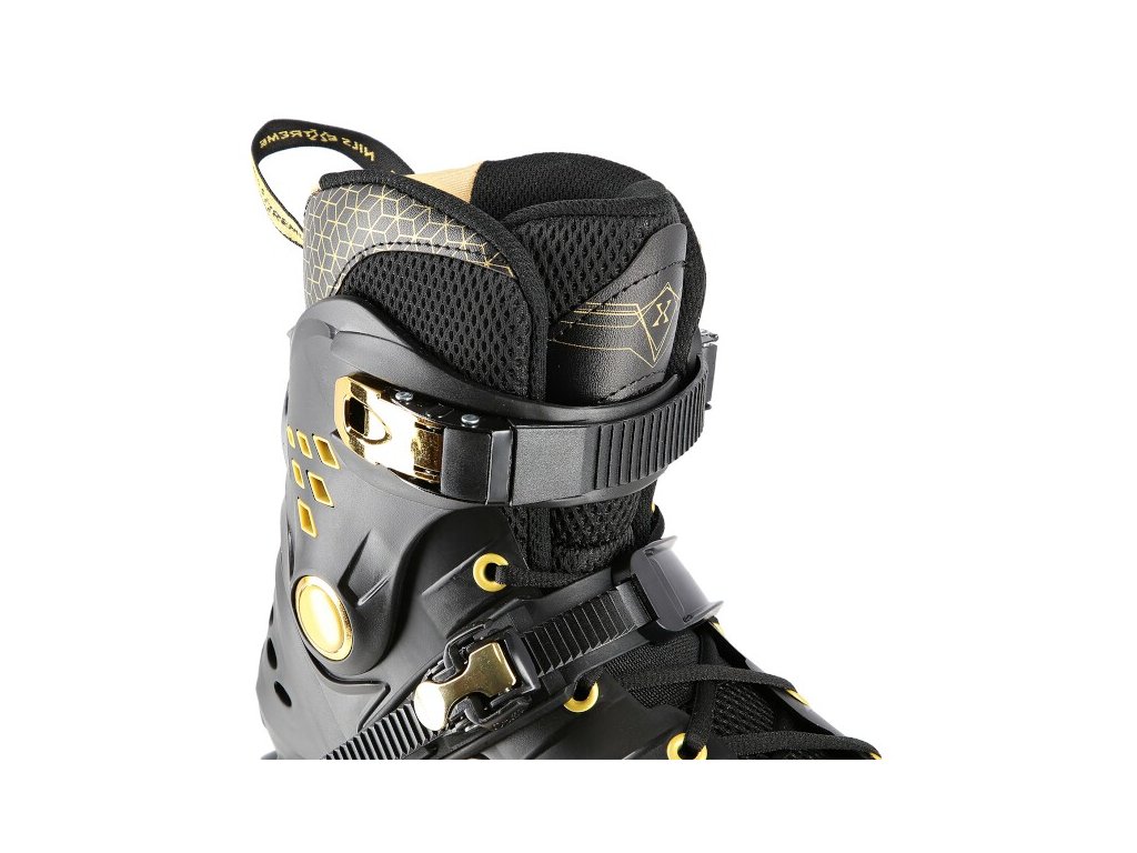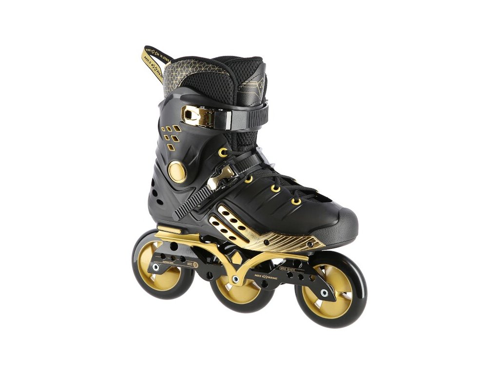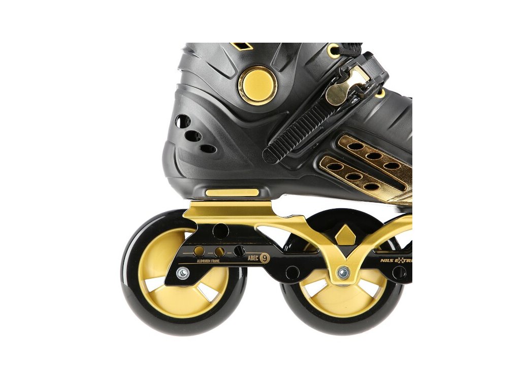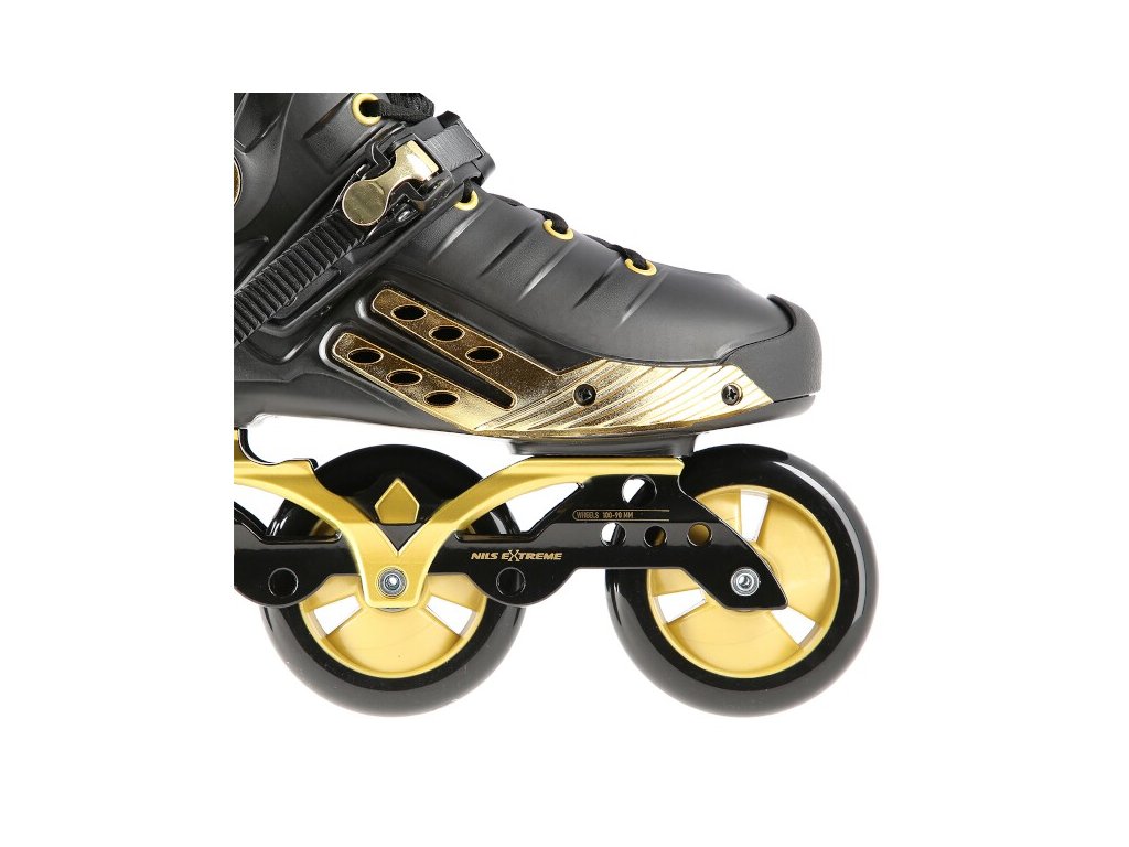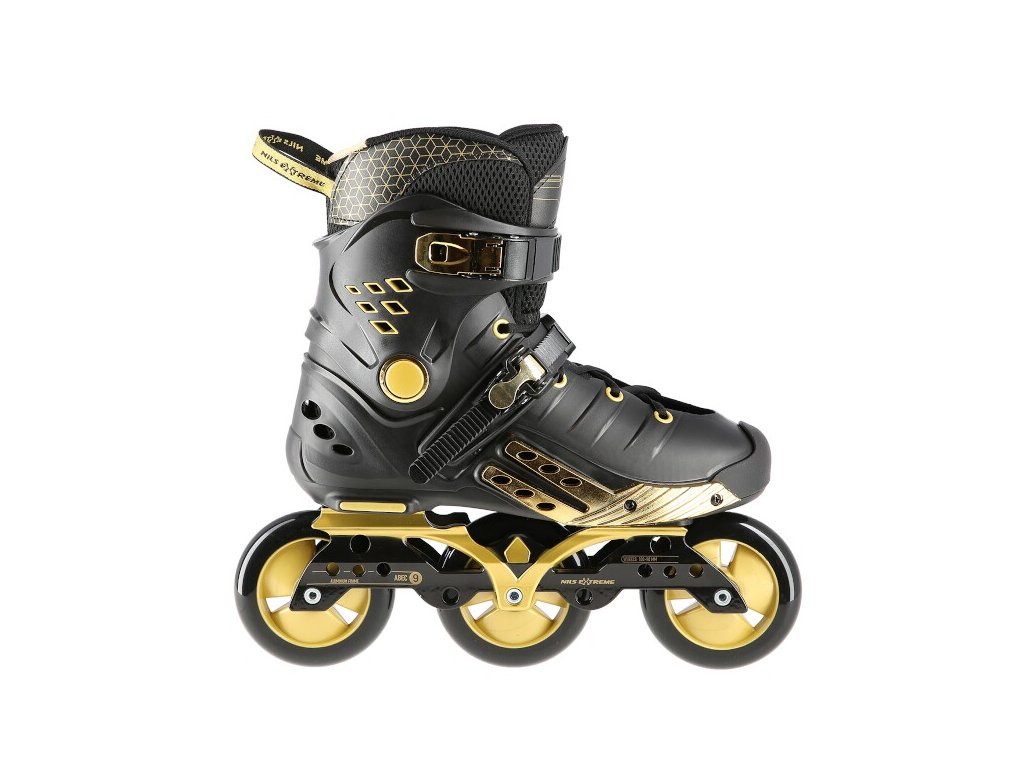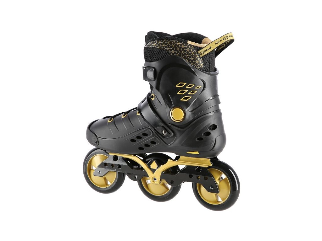 NILS Extreme NA20006 jsou freeridové brusle určené pro středně pokročilé a pokročilé bruslaře. Design brusle se opírá o kombinaci černé a zlaté barvy, tvrdá bota je v úrovni paty a středu chodidla vybavena velkými otvory pro dostatečnou ventilaci, takže se noha v brusli nebude nadměrně potit. Vysoký jízdní komfort zaručuje vnitřní bota vyrobená z kombinace EVA pěny, síťoviny Mesh a semiše.