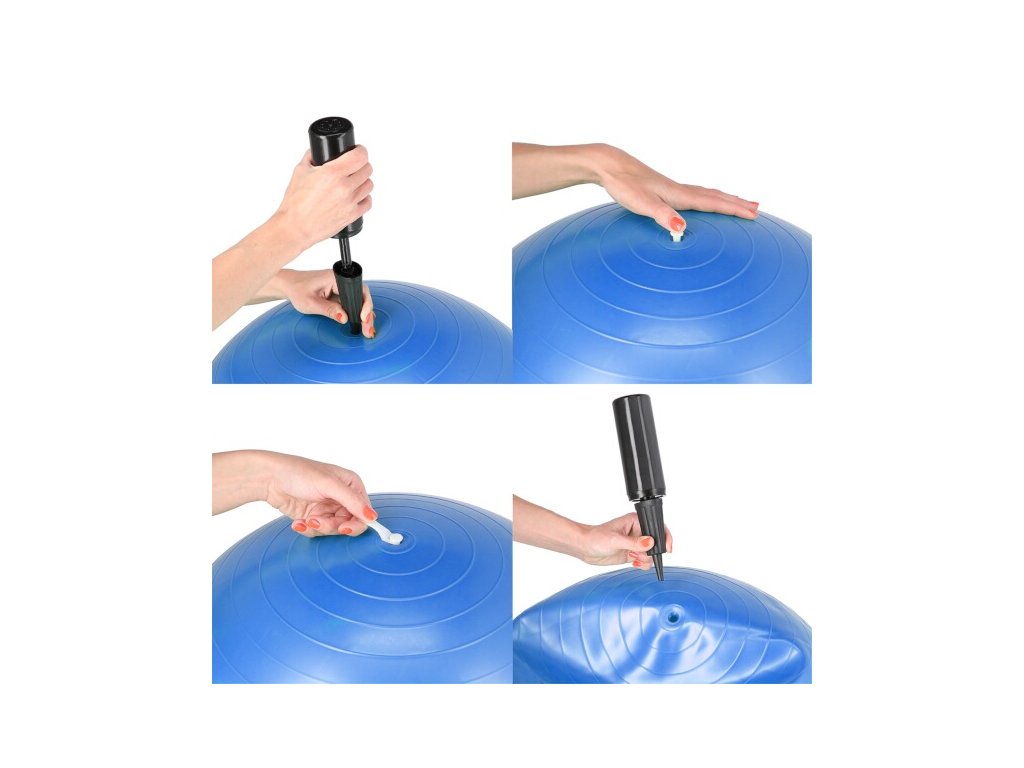 Gymnastický míč je vyroben z velice odolné gumy s protiskluzovým povrchem. Součástí balení je ruční pumpička, pomocí které lze míč nafouknout, špunt a přípravek pro vyjmutí špuntu z míče. Průměr míče by měl odpovídat výšce postavy, pro správný výběr naleznete níže přehledovou tabulku.
