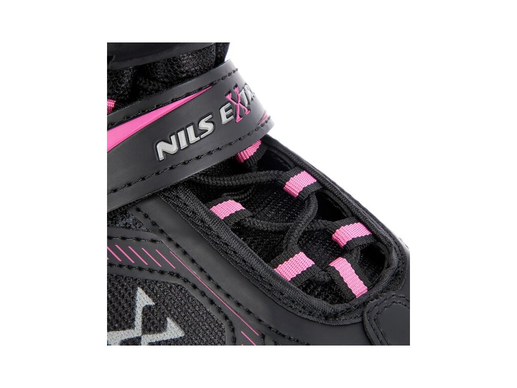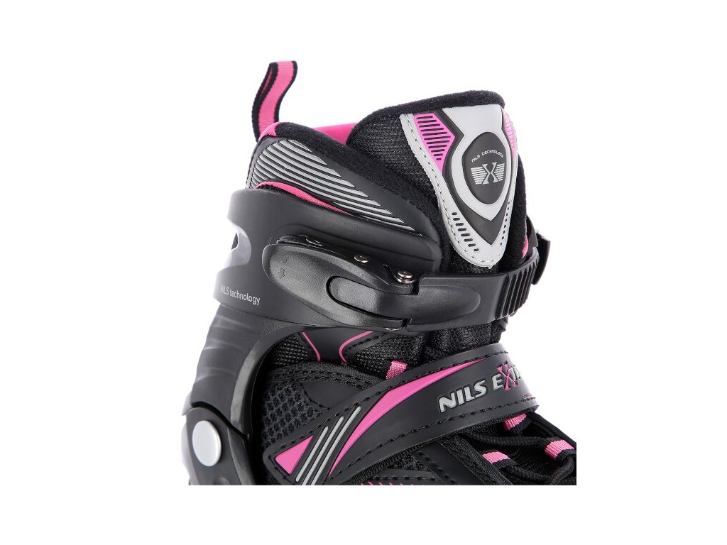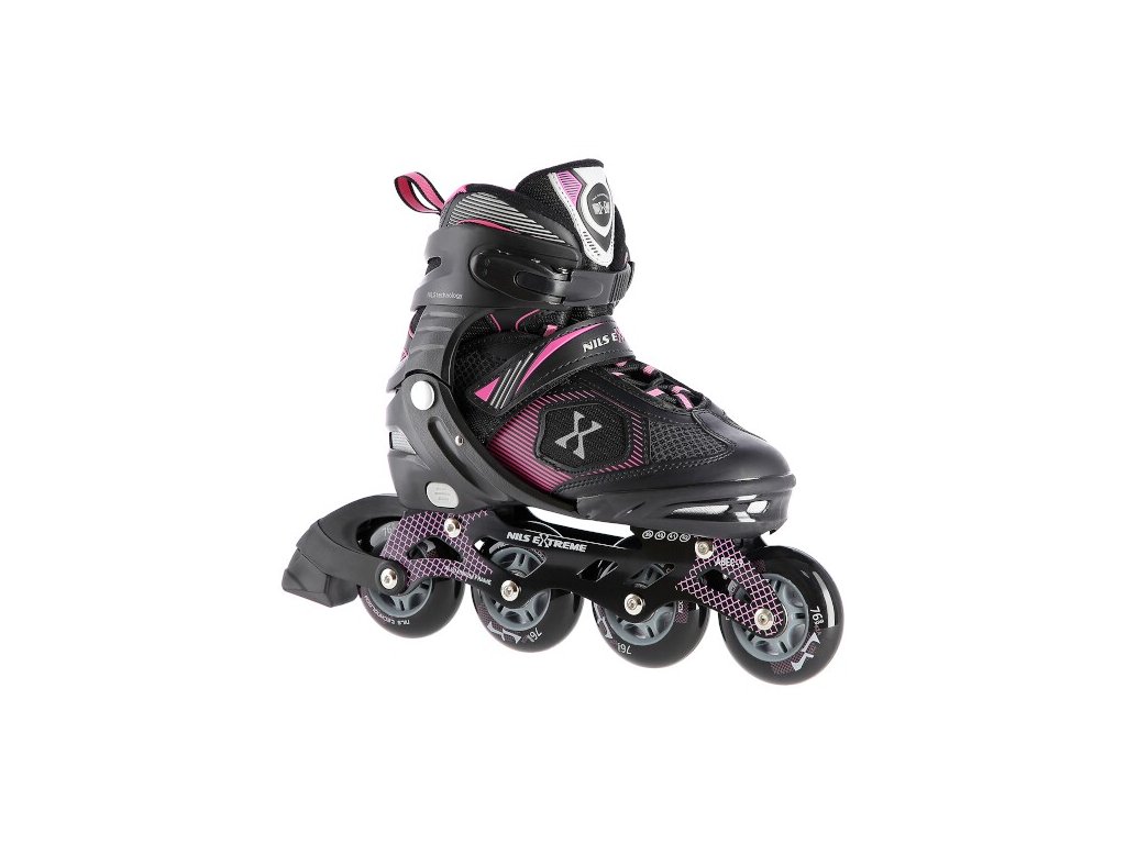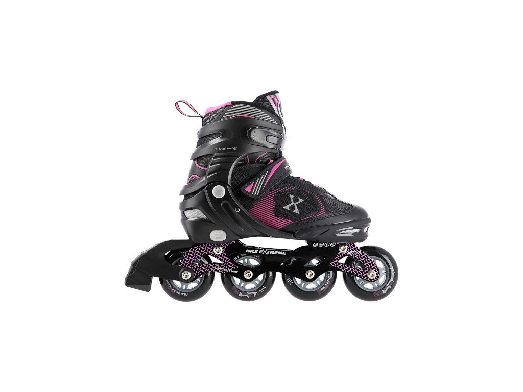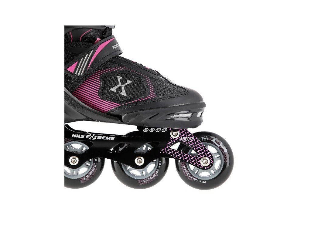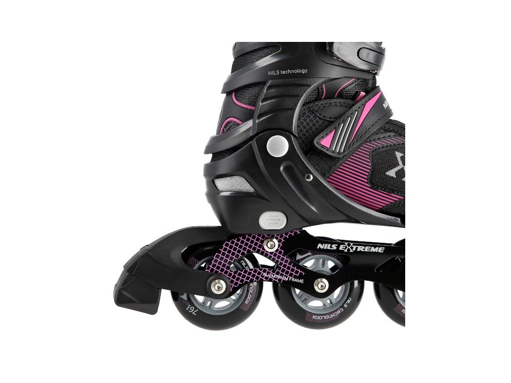 Kolečkové brusle NILS Extreme NA9080 jsou určeny k rekreační jízdě začínajících a mírně pokročilých bruslařů po rovných a hladkých stezkách, jako například po asfaltu. Lehká a odolná bota zajišťuje bezpečnost při jízdě. Systém ventilace a tvarovaná stélka boty přímo ovlivňují zvýšení uživatelského komfortu. Jedná se o model s nastavitelnou velikostí, kdy každá brusle má na výběr ze 4 rozměrů. Pomocí jednoduchého řídicího systému lze snadno a rychle nastavit velikost boty na noze uživatele. Kolečka s tvrdostí 82A jsou uložena v hliníkové liště, dobře přiléhají k podkladu a částečně pohlcují nervnosti. Model NA9080 je osazen ložisky ABEC 9, která se vyznačují precizním zpracováním a nízkým odporem, kdy jízda má dobrou setrvačnost a na bruslích tak lze urazit dlouhou vzdálenost bez vynaložení zbytečné síly.
