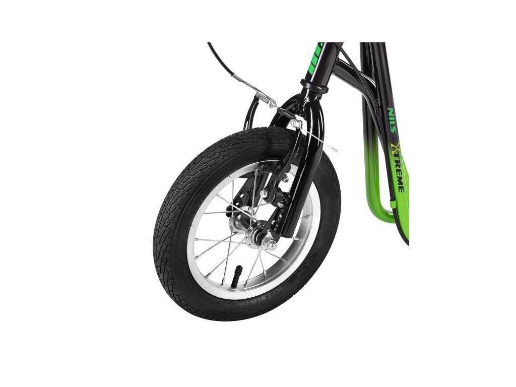 Koloběžka NILS Extreme WH117BN má nosnost 80 kilogramů a je tak určená pro děti a dorost. Rám, vidlice a řídítka jsou vyrobeny z kvalitní oceli. 12", hliníkové ráfky jsou obuty pumpovanými pneumatikami, které zaručují vysoký jízdní komfort a snadné překonávání drobných nerovností. Model WH117BN je tedy ideální volbou pro jízdu po asfaltových silnicích, dlážděných městských uličkách, ale i po lesních stezkách.