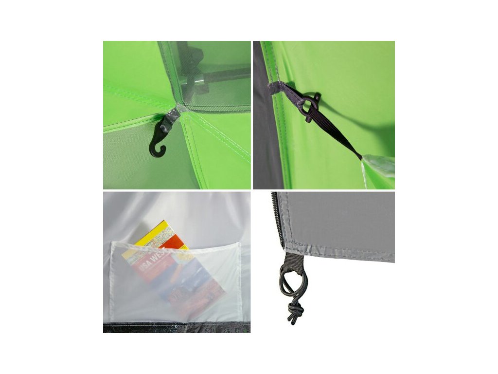 Navíc je stan vybaven čtyřmi vnitřními kapsami, kam schováte své věci, a dvěma úchyty pod stropem, díky kterým můžete zavěsit lampu.
