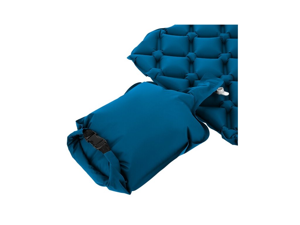 Ve složeném stavu zabírá podložka velmi málo místa a její skládání je velmi jednoduché. Stačí odšroubovat ventil a karimatku srolovat od horního okraje. Nemusíte se bát, že se sama rozbalí, protože má popruh, který podložku po srolování zajistí. V sadě je navíc praktické pouzdro, do kterého můžeme karimatku zabalit. Usnadní vám přepravu a navíc chrání podložku před poškozením. Díky své velikosti a hmotnosti jen 0,68 kg ji můžete mít snadno u sebe na každé cestě.